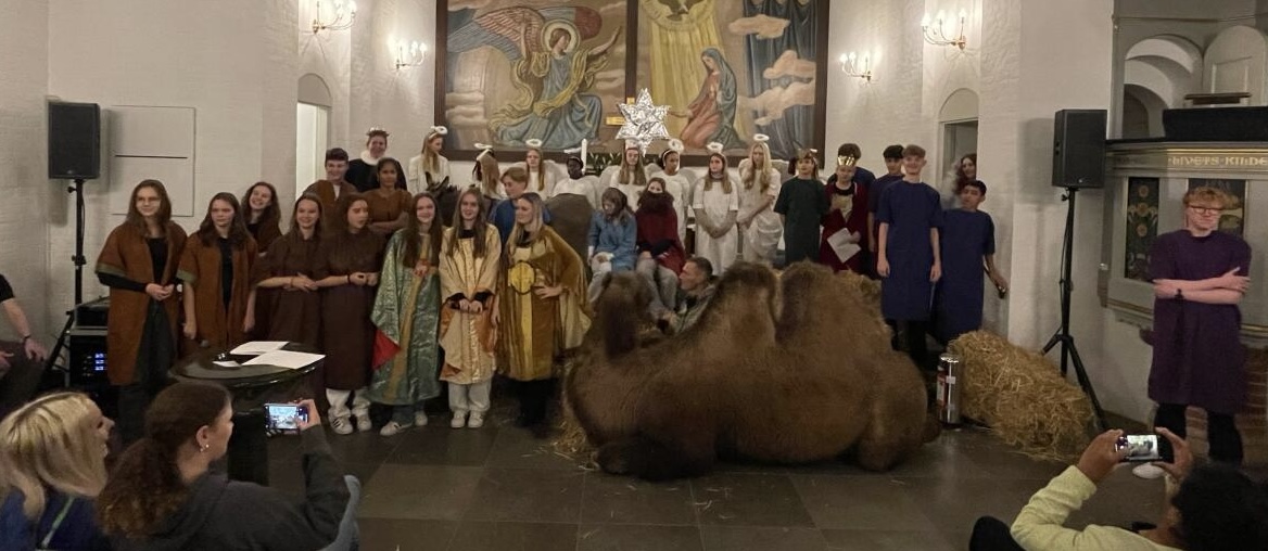 ”For andet år i træk, har vi haft stor succes med at lave krybbespil med vores 38 konfirmander. Fortællingen omskriver de selv,og på dagen har vi lejet et levende æsel og en kamel. Det er en kæmpe succes” Sådan fortæller sognepræst i Davids Kirke på Østerbro Helena Hauge.